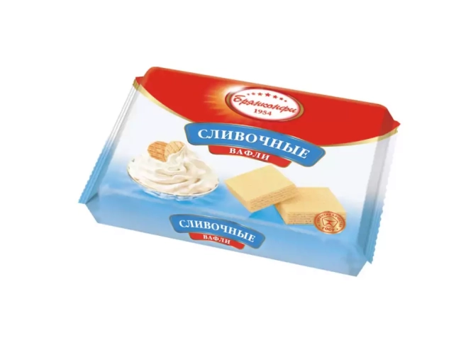 Вафли тонкие, хрустящие, со сливочной начинкой, упакованы в яркую, привлекательную коробку