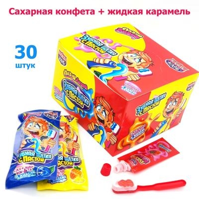 Состав сахарной конфеты: сахар, глюкозный сироп, патока, регулятор кислотности (лимонная кислота), ароматизаторы (клубника, голубика, ананас), красители Е102, Е129, Е133.Состав жидкой карамели: глюкозный сироп, сахар, питьевая вода, регуляторы кислотности (лимонная кислота, яблочная кислота), консервант (сорбат калия), ароматизаторы (клубника,голубика,ананас), красители Е102, Е129, Е133.
