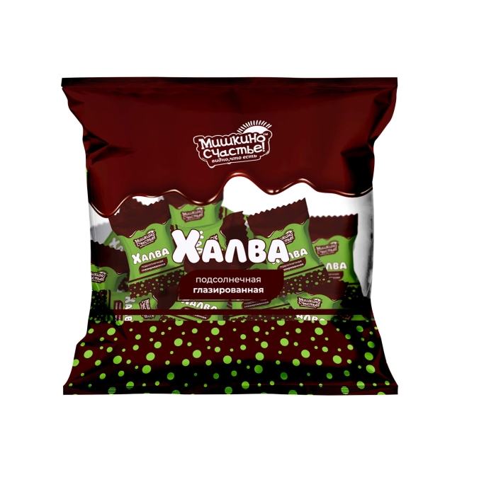 Конфеты халва подсолнечная глазированная. Ядро подсолнечника тертое, глазурь кондитерская (сахар, заменитель какао-масла лауринового типа, какао-порошок, эмульгатор лецитин соевый, ароматизатор), патока, сахар, пенообразователь экстракт мыльного корня, ароматизатор «Ванилин». Возможно наличие незначительного количества арахиса, кунжута.