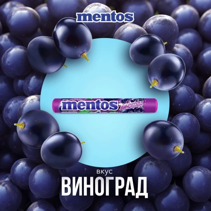 Вкус винограда в жевательных драже Mentos такой яркий и сочный благодаря тому, что в их состав входит фруктовый сок.