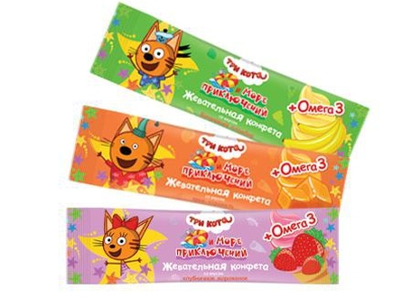 Жевательные конфеты для детей "Три кота" от ГК "Сладкая сказка" - натуральный продукт, с Омега-3 в составе,которая способствуют здоровому и правильному росту ребёнка, повышает количество серотонина ("гормона счастья") в крови, улучшает зрение, укрепляет кости и увеличивает внимательность. Такие конфеты - прекрасный подарок сладкоежкам. Жевательные конфеты "Три кота" производятся на российской фабрике "МАК-Иваново" с использованием только натуральных красителей и ароматизаторов. Конфеты не содерж