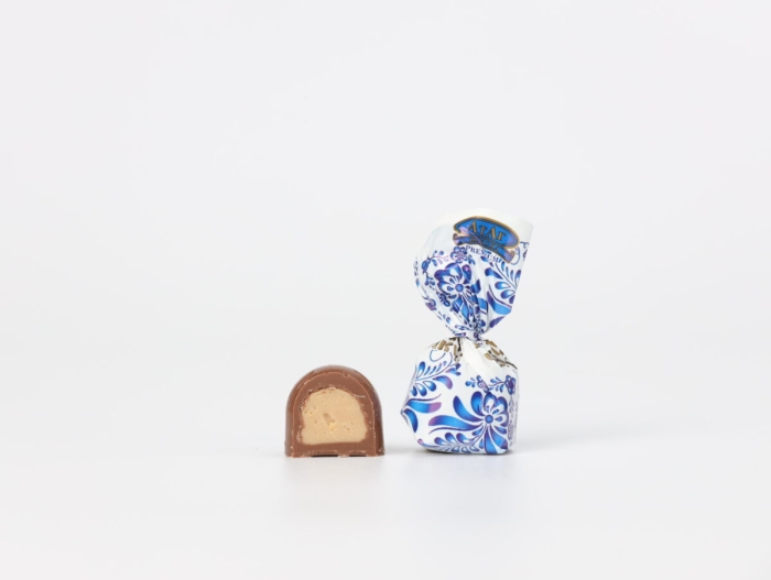 Конфеты мини-купольной формы в фирменной молочной глазури с нежной светлой начинкой с добавлением тертого арахиса с ароматизатором "Ванилин".