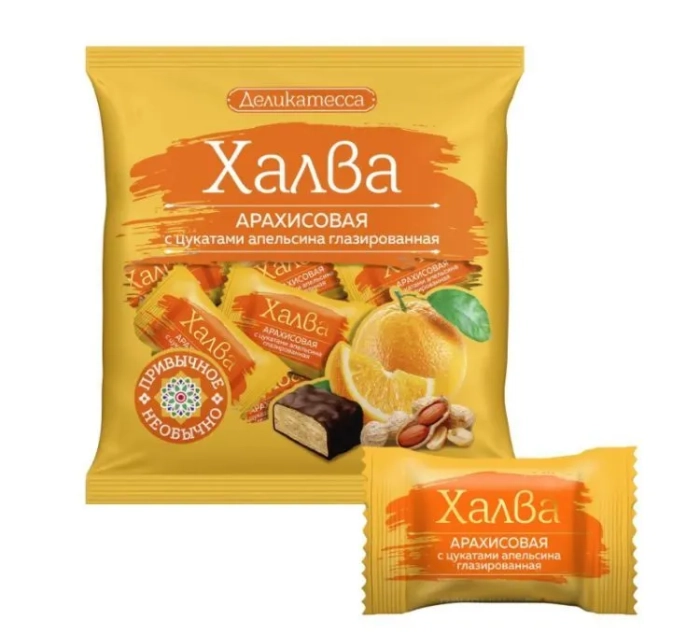 Конфеты Халва арахисовая с цукатами апельсина от торговой марки ДЕЛИКАТЕССА – привычная халвичная конфета с необычными дополнениями. Вкусная конфетка со вкусом сочного апельсина, тонким ароматом и правильной текстурой халвы по специальной технологии, которую мы храним много лет. Удобная упаковка для семейного чаепития или приятного презента близкому человеку. Побалуйте себя новыми неповторимыми вкусами халвичной конфеты с апельсином.