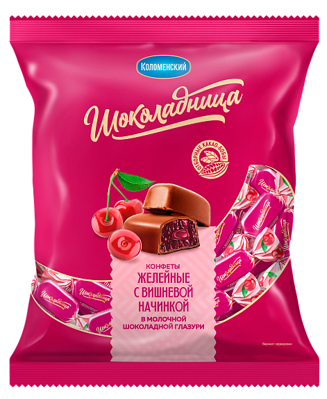 Сахар, патока, молочная шоколадная глазурь (сахар, эквивалент масла какао (фракция пальмового масла, масло ши, эмульгатор соевый лецитин, антиокислитель концентрат смеси токоферолов), сыворотка молочная сухая, какао тертое, молоко сухое цельное, какао-порошок, масло какао, жир молочный (сливки пастеризованные, масло сливочное), эмульгатор - соевый лецитин, ароматизатор «Ванилин»), пюре яблочное, вода, желирующий агент - пектины, сок концентрированный из вишни, регулятор кислотности - молочная ки