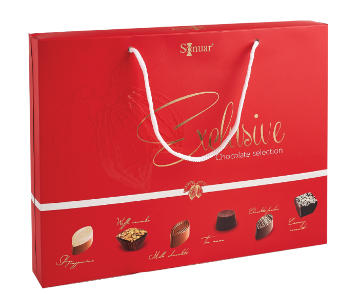 1. Конфеты из темного шоколада с сочетанием белой глазури и с кремовой начинкой со вкусом капучино. 2. Шоколадные конфеты с кремовой начинкой с добавлением молотого кофе и посыпкой из вафельной крошки. 3. Конфеты из молочного шоколада с кремовой начинкой со вкусом шоколада фондю. 4. Конфеты из молочного шоколада с кремовой начинкой со вкусом чайной розы. 5. Шоколадные конфеты с кремовой начинкой со вкусом шоколада фондю. 6. Шоколадные конфеты с кремовой начинкой со вкусом сливочного кокоса и мен
