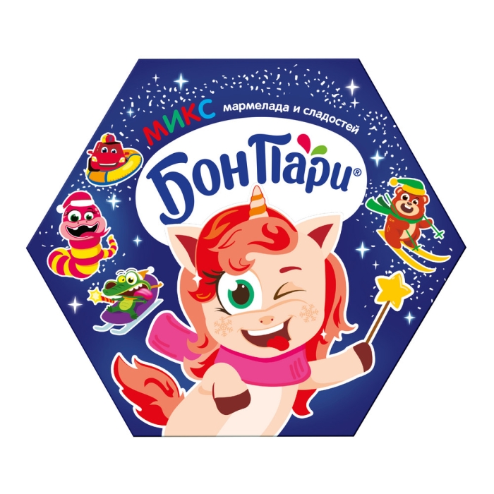 Новогодний комплект БОН ПАРИ® и весёлая компания – яркий и вкусный подарок на Новый Год. Отлично подойдет как для близких, так и для себя Главный герой БОН ПАРИ® - красный единорог - вдохновлен символом наступающего 2026 года - красной лошадью. Внутри вы найдёте микс от любимых брендов: мармелад и сладости. Подарите близким волшебный праздник вместе со всеми любимыми героями – весёлая змейка, забавный медвежонок и единорог.