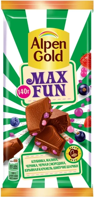 Открой взрывной вкус Alpen Gold MAX FUN! Ягодно-сочный в каждом кусочке, а карамель и шипучие шарики разбавляют эту ягодную «вечеринку» и дают нескучный вкус! Хочется фана? Скорее за шоколадкой!
