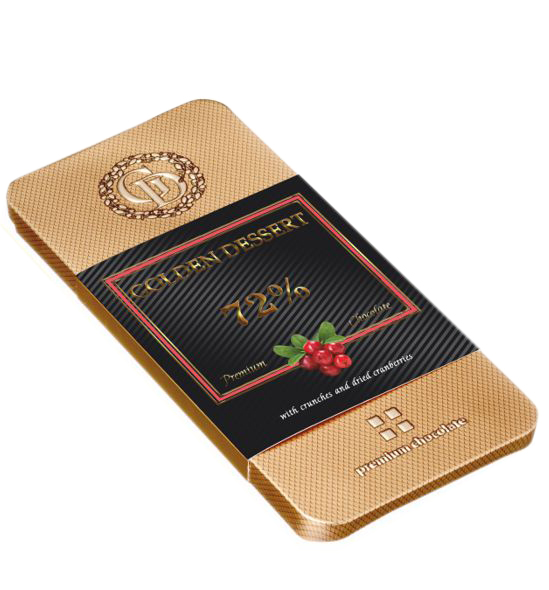 Шоколад горький 72% какао-продуктов с кранчами и сушеной клюквой торговой марки «Golden Dessert» - это настоящий горький шоколад с высоким содержанием какао-продуктов - 72% с добавлением сущеной клюквы и кранчей клюквы.