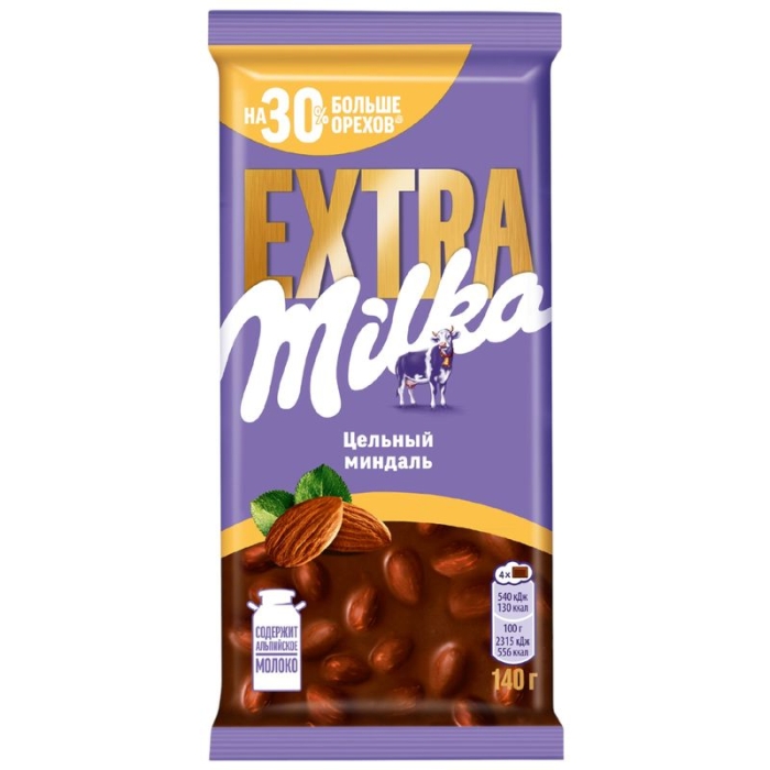 Milka Extra с цельным миндалем — большая плитка нежного шоколада молочного с ароматными цельными орехами. Шоколад изготовлен из какао высокого качества с добавлением альпийского молока и содержит на 30% больше орехов. Шоколад с цельным миндалем дополнит завтрак, подойдет для быстрого перекуса и уютного семейного вечера. Соберите друзей и родных за одним столом и возьмите шоколад к чаю, чтобы поделиться теплом и искренней нежностью!