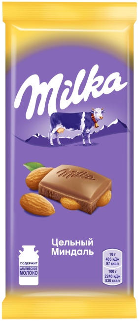 Молочный шоколад Милка с цельным миндалем имеет выраженный молочно-ореховый аромат и сладкий вкус. Благодаря натуральному миндалю в составе, шоколад становится более сытным. Продукт изготовлен на основе натуральных орехов и какао-бобов.