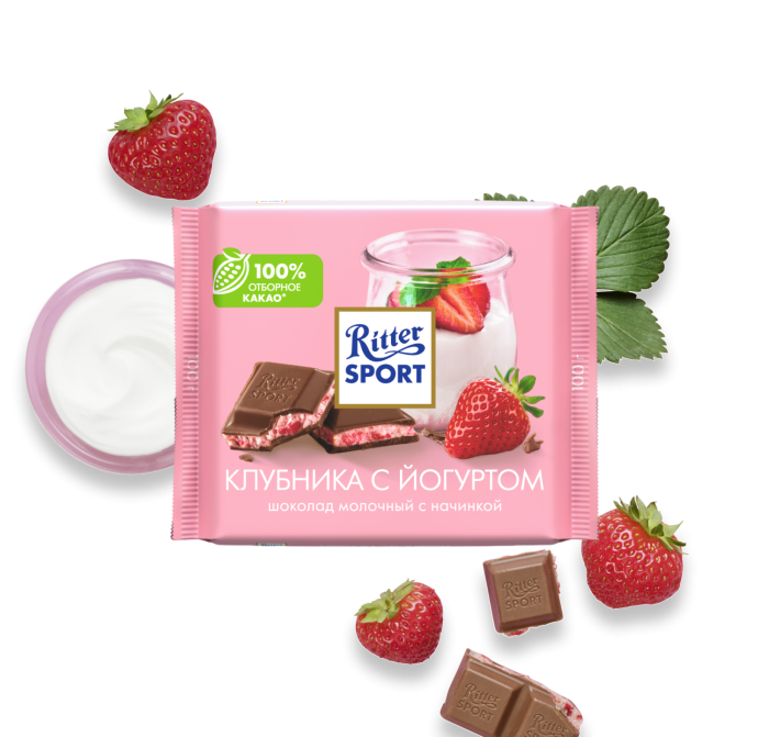 шоколад молочный (сахар, масло какао1, какао тёртое1, сухое цельное молоко, лактоза, сухое обезжиренное молоко, молочный жир, эмульгатор соевый лецитин); начинка (пальмовое масло2, сахар, сухой обезжиренный йогурт (молоко обезжиренное, закваска), клубника сушёная измельчённая, сухие сливки, мальтодекстрин, эмульгатор соевый лецитин).