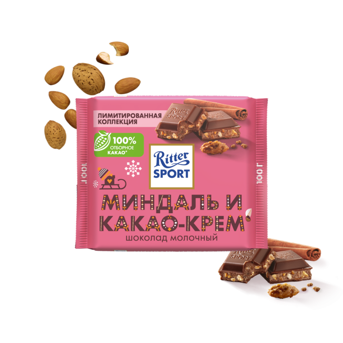 шоколад молочный (сахар, масло какао1, какао тёртое1, сухое цельное молоко, лактоза, сухое обезжиренное молоко, молочный жир, эмульгатор соевый лецитин); начинка (сахар, масло пальмовое2, сухое цельное молоко, сухое обезжиренное молоко, миндаль карамелизированный (ядра орехов миндаля измельчённые, сахар), какао тёртое1, специи (корица, кардамон, гвоздика), эмульгатор соевый лецитин).