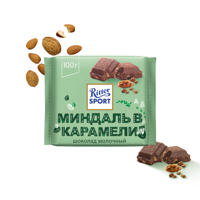 шоколад молочный (сахар, масло какао1, какао тёртое1, сухое цельное молоко, лактоза, сухое обезжиренное молоко, молочный жир, эмульгатор соевый лецитин); миндаль карамелизированный (дроблёный миндаль, сахар).