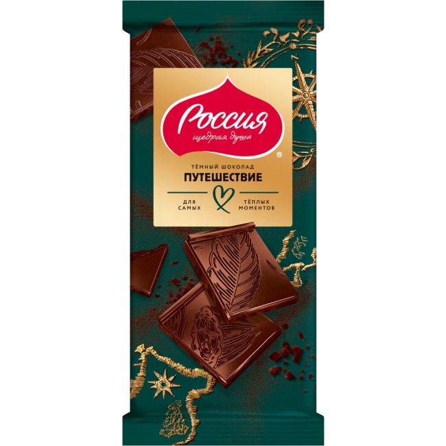 Храня верность традициям, мы создаём качественный шоколад по оригинальным рецептам. Шоколад Путешествие Темный шоколад от бренда "Россия"-щедрая душа! - это классика темного шоколада с высоким содержанием какао-продуктов. Благородный терпкий вкус темного шоколада Путешествие с насыщенными нотками рома и притягательным вкусом какао - не оставят в стороне ценителей настоящего темного шоколада.