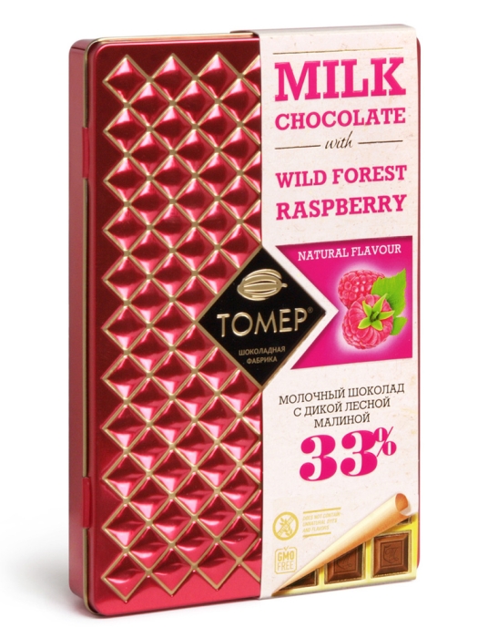 Сахар, какао-масло, молоко сухое обезжиренное, како тертое, молоко сухое цельное, порошок малины (мякоть и сок малины, сконцентрированным методом низкотемпературной распылительной сушки), эмульгатор лецитин соевый, экстракт малины, стручки ванили