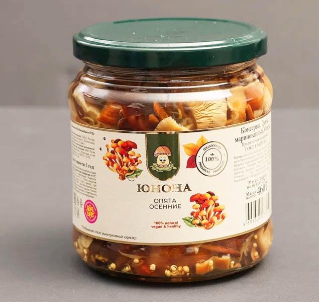 опята, вода питьевая, сахар, соль, регулятор кислотности — уксусная кислота, семена горчицы, гвоздика, перец красный сладкий, перец душистый горошком.