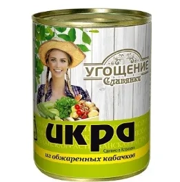 Икра из кабачков «Угощение славянки» — это готовое блюдо, сочетание обжаренных кабачков, репчатого лука, моркови и других ингредиентов — это вкусно и полезно. Кабачковая икра — отличная закуска, ее можно намазывать на бутерброды и тосты, галеты и диетические хлебцы. Она может использоваться в качестве соуса к мясным и рыбным блюдам, а также как заправка для супов.