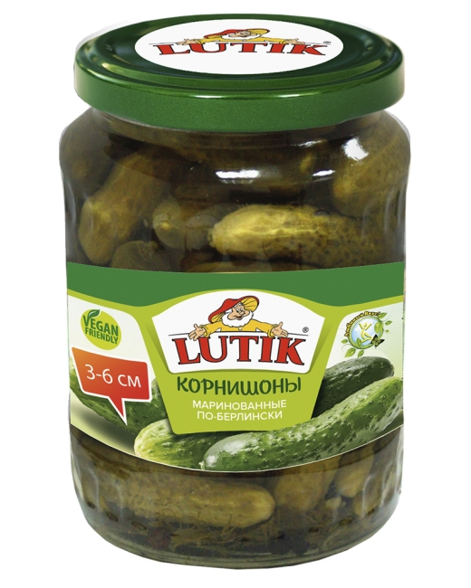 Корнишоны (3-6см), маринад: вода, сахар, соль, пряности (укроп, перец, чеснок), морковь, регулятор кислотности – уксусная кислота, уплотнитель – хлорид кальция