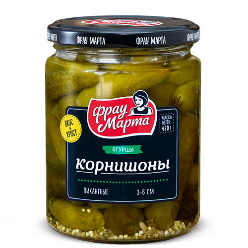 Пикантные корнишоны от «Фрау Марты» любимы хозяйками за гармоничный вкус и аккуратный размер огурчиков 3-6 см. Идеальный объем баночки 350 мл оптимален для создания разнообразных закусок-канапе к застолью или просто "похрустеть" с основным блюдом за ужином.