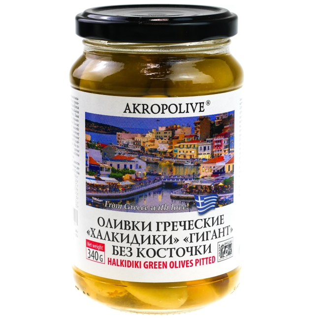 Вода питьевая, оливки зеленые сорта "Халкидики" без косточки, вода, соль морская, регулятор кислотности, лимонная кислота, молочная кислота, антиокислитель: аскорбиновая кислота.