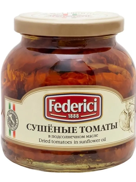 Сушеные томаты Federici в подсолнечном масле - секрет итальянской кулинарии. Продукт произведен по классической рецептуре, из отборных томатов, с добавлением уникальных ингредиентов.