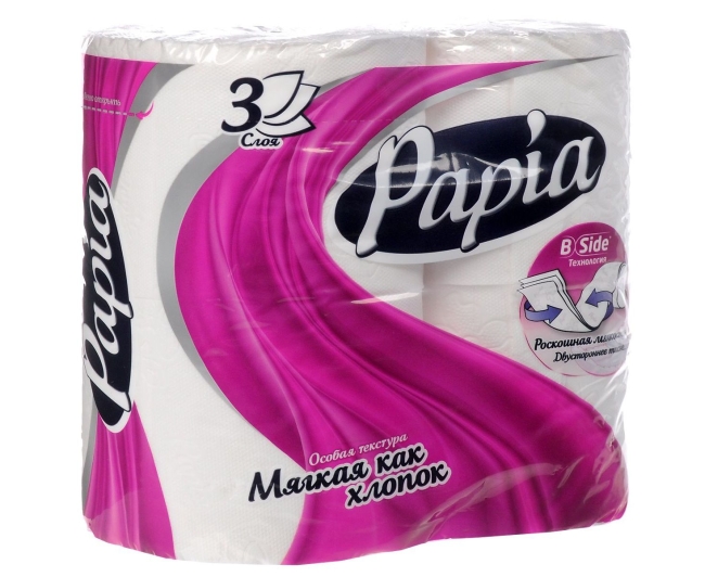 Трехслойная туалетная бумага Papia изготовлена из целлюлозы высшего качества. Листы оформлены тисненым рисунком в виде цветов и надписи Papia. Мягкая, нежная, но в тоже время прочная, бумага не расслаивается и отрывается строго по линии перфорации. Бумага не ароматизированная.