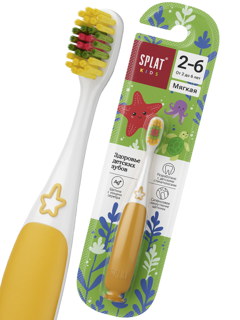 Детская зубная щетка SPLAT Kids 2-6 – бережный уход за зубками вашего ребенка! Прорезиненная ручка эргономичной формы обеспечивает комфортную и безопасную чистку зубов детской рукой, а присоска отвечает за гигиеничное хранение. Мягкая густая щетина бережно очищает эмаль молочных зубов и придесневые зоны Разработано совместно с детскими стоматологами. Детская зубная щетка разработана специально для ухода за полостью рта малышей от 2 лет.