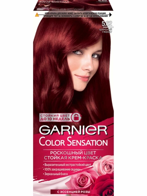 Крем-краска Garnier Color Sensation Царский гранат с точным попаданием в тон, стойким выразительным оттенком и 100% покрытием седины. Формула с эссенцией розы увлажняет и смягчает волосы, дарит комфорт коже головы во время окрашивания. Супернасыщенные пигменты проникают глубоко в структуру и сохраняют оттенок ярким до 10 недель. Частицы перламутра придают волосам ослепительное сияние. Цветочный аромат краски дарит наслаждение в процессе окрашивания. Оттенок 5.62 «Царский гранат» Color Sensation