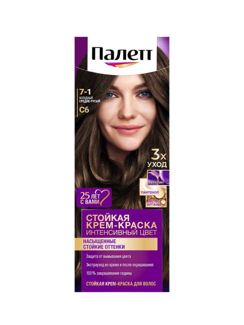 Благодаря тройной системе ухода стойкая крем-краска для волос Палетт обеспечивает бережное окрашивание. С аммиаком. Комплекс с Кератином, Пантенолом и Аргановым маслом проникает глубоко в структуру волоса, восстанавливая, увлажняя и питая его изнутри. Активные вещества оказывают смягчающее и укрепляющее воздействие, делая волосы гладкими и блестящими.