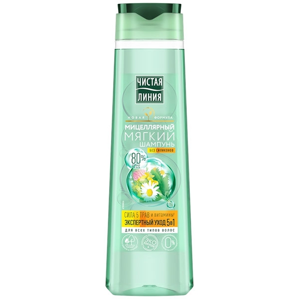 Эксперты Института Чистая линия создали коллекцию инновационных средств по уходу за волосами на мицеллярной основе. Они не раздражают чувствительную кожу головы, сохраняют ее гидролипидный баланс и не пересушивают волосы, даже при ежедневном мытье. Мицеллярный шампунь создан для мягкого очищения волос без сухости, 5 действий в 1 шампуне. Мицеллярная основа бережно очищает и увлажняет волосы, не повреждая даже истонченные кончики длинных волос, полезная формула 80% отвара трав наполняет волосы си