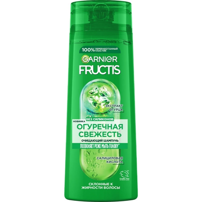 Шампунь, продлевающий свежесть волос. Специально создан для волос, склонных к жирности и быстрому загрязнению. Благодаря уникальной комбинации экстракта огурца и витаминов B3 и B6 шампунь Fructis Огуречная свежесть надолго очищает волосы и кожу головы, способствует укреплению волосяных луковиц и росту более сильных волос. Активный концентрат фруктов в составе обеспечивает антиоксидантную защиту, делает волосы плотными и блестящими.