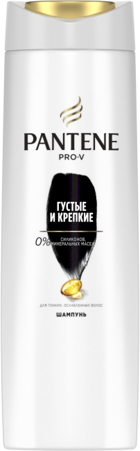 Шампунь PANTENE Pro-V (Пантин Про-Ви) Густые и Крепкие идеально подходит для тонких, ослабленных волос. Благодаря уникальному комплексу Pro-V он деликатно очищает волосы, насыщая их активными питательными веществами, и способствует укреплению волос от корней до кончиков. Не содержит силиконов и минеральных масел. Подходит для окрашенных волос. Для достижения максимального эффекта используйте в сочетании с бальзамом-ополаскивателем и маской; дополните уход маслом Интенсивное Укрепление и спреем д