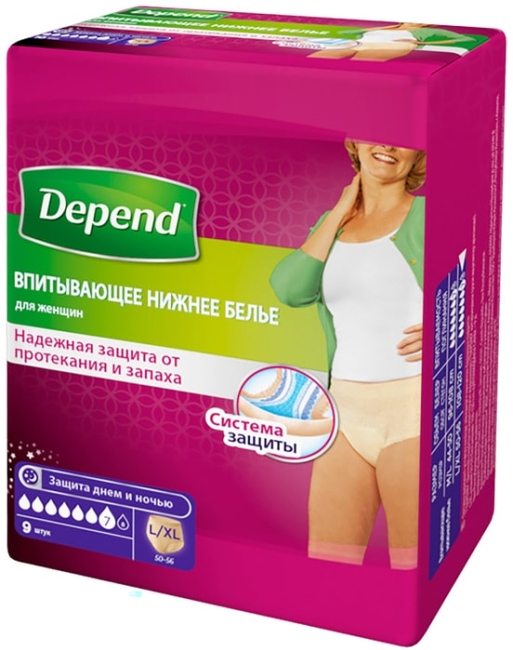 Впитывающее нижнее белье Depend для женщин L/XL (50-56), 9 шт. Женский организм подвергается большой нагрузке во время вынашивания малыша: беременность не всегда проходит для него бесследно. К одним из частых последствий подобных нарушений относится недержание мочи, которое может наблюдаться как на последних сроках беременности, так и в течение некоторого времени после родов. К счастью, решение этой проблемы уже давно существует: многие женщины прибегают к использованию урологических изделий