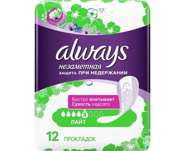 Прокладки Always Незаметная защита при недержании Лайт, 12 шт. Для тех моментов, когда вам необходима дополнительная защита, есть прокладки Always «Незаметная защита при недержании». Они впитывают в 3 раза больше жидкости, чем обычные ежедневные прокладки*, и надолго сохраняют сухость. Кроме того, они оснащены технологией нейтрализации запаха, которая дарит непревзойденную свежесть и обеспечивает чувство уверенности. Попробуйте прокладки Always «Незаметная защита» для защиты при недержании. *по