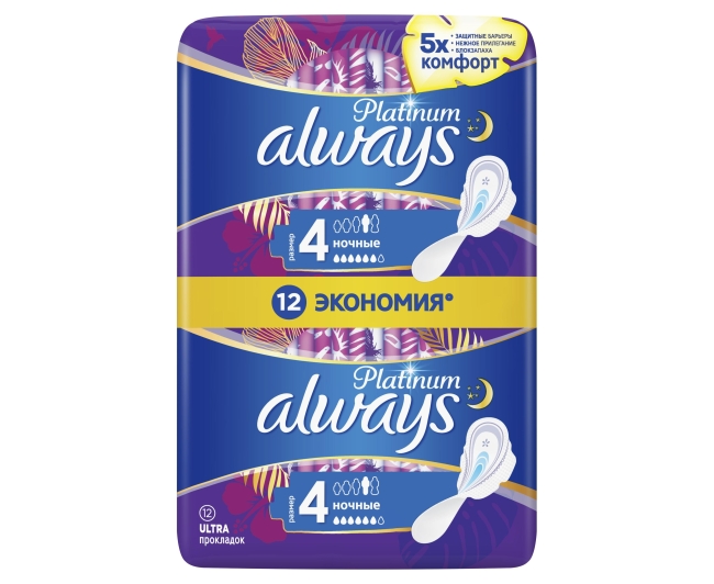Гигиенические прокладки Always Platinum обеспечивают лучшее сочетание комфорта и защиты среди прокладок Always. Always Platinum более комфортны (по сравнению с Always Ultra) благодаря тысячам микроподушечек и новым, мягким как шелк крылышкам. Они также обеспечивают лучшую защиту (по сравнению с Always Ultra) благодаря защитным боковым барьерам и ультравпитывающему внутреннему слою, который запирает влагу внутри. Always Platinum Ночные (Размер 4) с крылышками рекомендованы для ночного использова