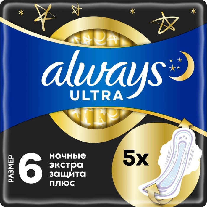 Наслаждайтесь спокойным сном благодаря тройной защите: гигиенические прокладки ALWAYS Ultra Secure Night Plus (ночные экстра защита плюс) с крылышками обеспечивают тройную защиту от протеканий и необходимости менять прокладку ночью. Обеспечьте себе наилучшую защиту с помощью Always My fit — специальной системы определения размера, которая помогает правильно подобрать прокладку на основании количества выделений и размера трусиков - Увеличенные на 9% передняя часть и на 85% — задняя часть по сравн