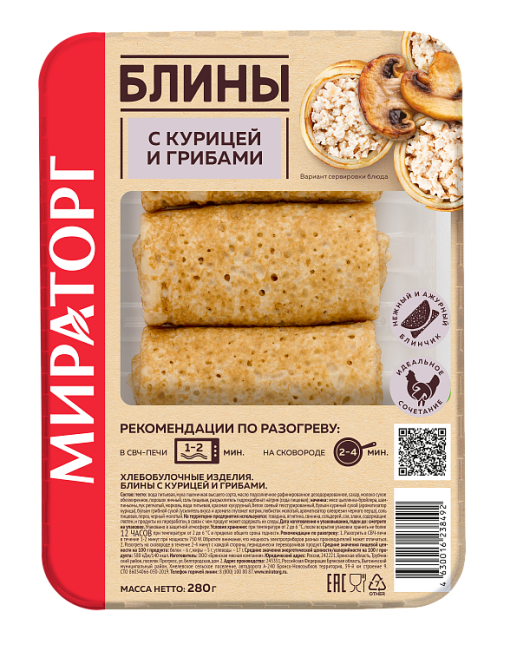 Кусочки фермерской курочки в сочетании с обжаренными шампиньонами дополняют вкус домашнего блинчика – идеальный вариант для быстрого перекуса.