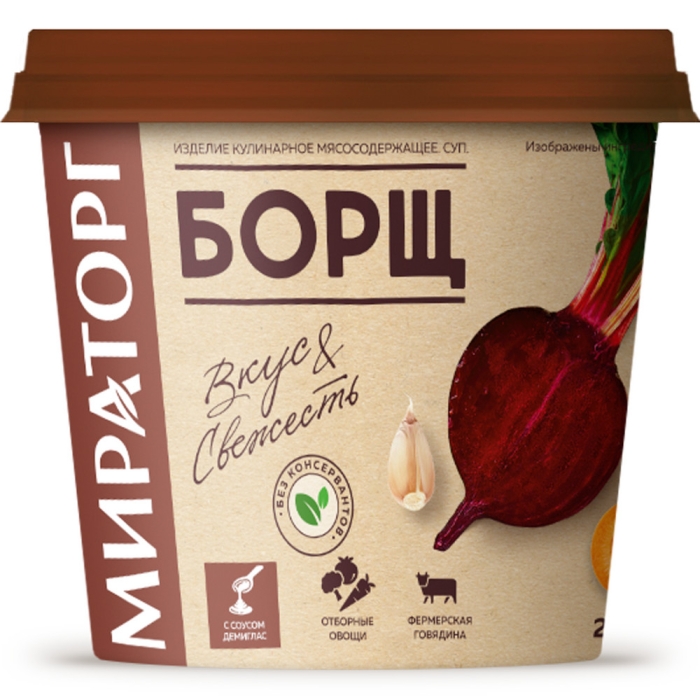 Борщ от Мираторг приготовлен по традиционному рецепту. Сытный мясной бульон, отборная говядина и свежие овощи – отличный вариант для приятного домашнего обеда.