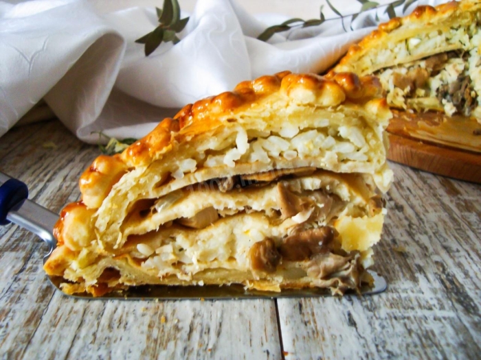 Мясо куриное, рис, тесто слоенное, шампиньоны, мука, молоко, яйцо, ванилин, сахар, специи, соль, масло растительное, консервант бензоат натрия Е211