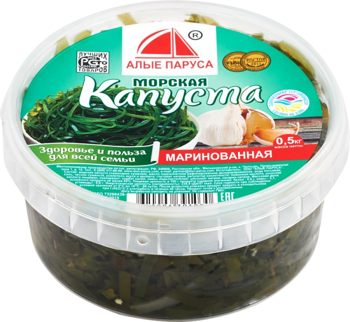 морская капуста сушеная (ламинария), масло подсолнечное дезодорированное рафинированное, соль поваренная пищевая, пряности, кислота лимонная, уксус столовый 9%, консервант (Е211).