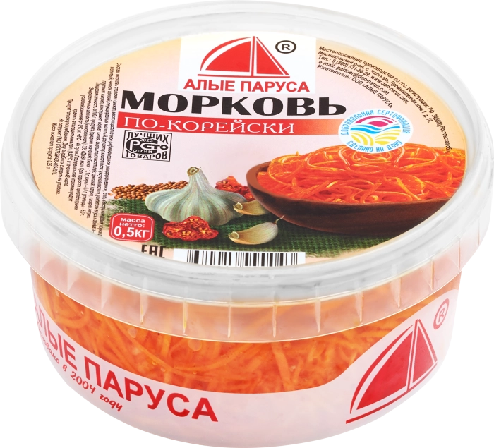 морковь столовая свежая, масло подсолнечное дезодорированное рафинированное, соль поваренная пищевая, сахар, пряности, уксус столовый 9%, консервант (Е211).