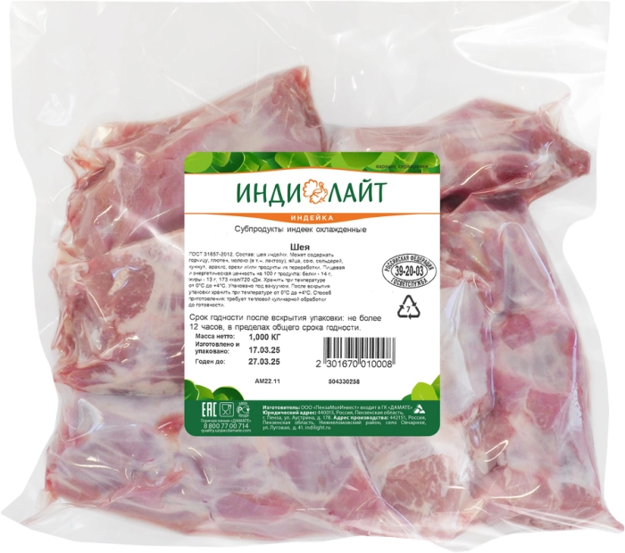 Шея индейки от торговой марки ИНДИЛАЙТ – восхитительное мясо птицы для быстрой обжарки, запекания или тушения. Диетическая индюшатина придется по вкусу поклонникам здорового питания. Индюшачья шея идеально подходит для шашлыка с предварительным маринованием, приготовления котлет и стейков.