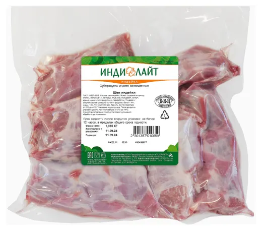 Шея индейки от бренда ИНДИЛАЙТ – нежная индюшатина, богатая белком и витаминами. Ароматное мясо птицы можно потушить в соусе или запечь в духовке с овощами. Нежное мясо шеи индейки никого не оставит равнодушным. Отличный продукт для всей семьи.