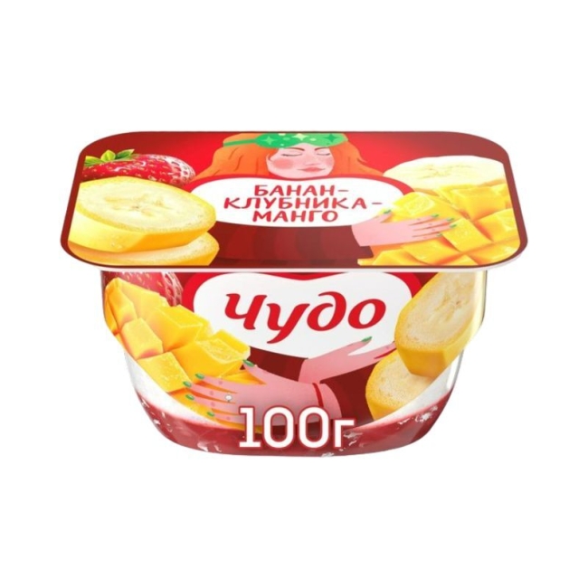 взбитая творожная основа (творог, сливки, йогурт, сахар, стабилизаторы (E1422, гуаровая камедь, тары камедь), желатин, ароматизаторы), фруктовый наполнитель со вкусом «Банан-клубника-манго» (вода, клубника, сахар, глюкозно-фруктозный сироп (G)*, стабилизатор Е1442 (Н)* или стабилизатор Е1422 (Т)*, ароматизаторы, банановое пюре, стабилизаторы (гуаровая камедь, ксантановая камедь), регуляторы кислотности (лимонная кислота, цитрат натрия 3-замещенный)).