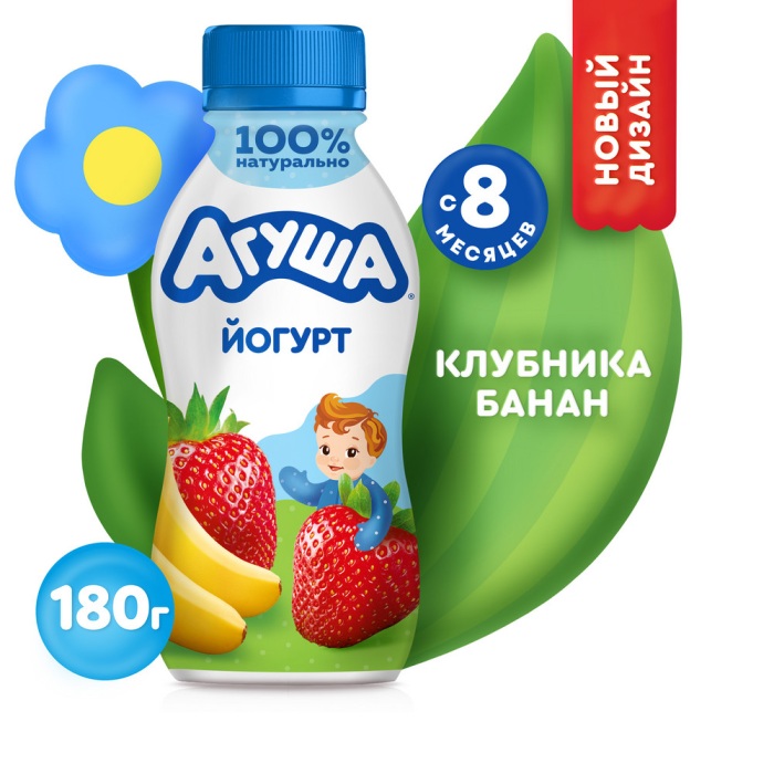 Питьевой йогурт «Агуша» Клубника-Банан дополнит и расширит рацион малыша с 8 месяцев: он сочетает вкус фруктов и ягод с пользой кисломолочного продукта. Этот детский йогурт произведен с использованием живой закваски из кисломолочных бактерий (Streptococcus thermophilus и Lactobacillus bulgaricus) и обогащен пробиотическими бифидобактериями, которые важны для комфортного пищеварения.