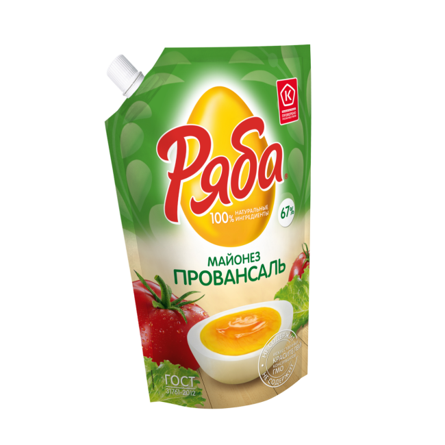 Майонез Ряба Провансаль – высококачественный продукт, классический вкус. В майонезе Ряба только 100% натуральные ингредиенты: свежее растительное масло, яйца и специи. В нем нет искусственных консервантов, красителей и ароматизаторов. Натуральный майонез Ряба - продукт без ГМО. Вкус и качество майонеза сохраняются благодаря уникальной рецептуре и инновационным технологиям изготовления.