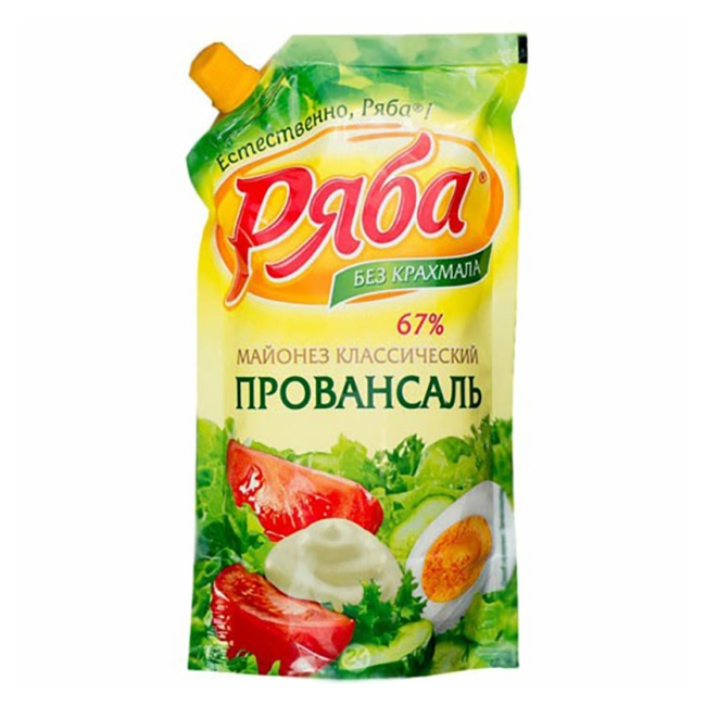 Майонез Ряба Провансаль – высококачественный продукт, классический вкус. В майонезе Ряба только 100% натуральные ингредиенты: свежее растительное масло, яйца и специи. В нем нет искусственных консервантов, красителей и ароматизаторов. Натуральный майонез Ряба - продукт без ГМО. Вкус и качество майонеза сохраняются благодаря уникальной рецептуре и инновационным технологиям изготовления.