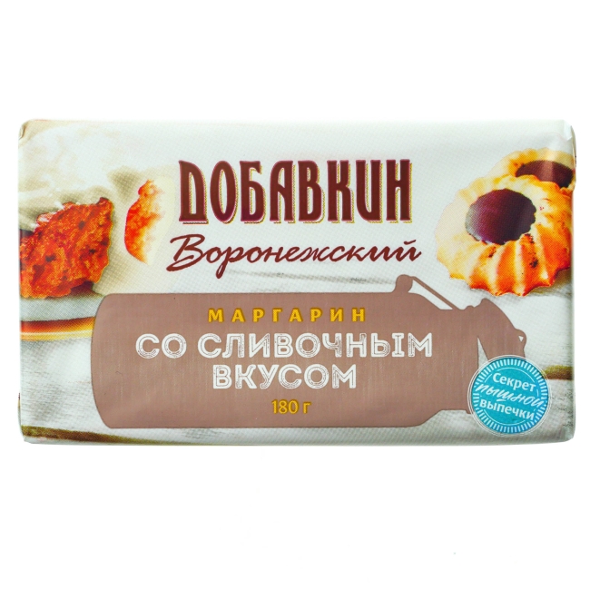 Маргарин Добавкин - это незаменимая основа многих тортов, пирожков и других видов выпечки. В его составе нет животных жиров, поэтому маргарин Добавкин не содержит холестерин.Без ГМО.Без крахмала.Приготовлено по ГОСТ.