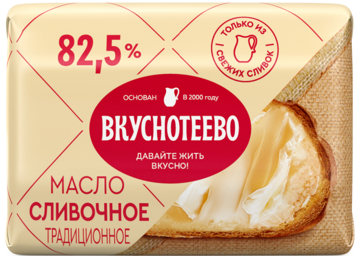 Масло «Вкуснотеево» изготовлено по особой технологии — способом холодного сбивания. При таком способе производства сливки не нагреваются и, соответственно, не разрушаются белковые связи. Таким образом, в сливочном масле сохраняется чистый, насыщенный вкус натуральных сливок. На 1 кг масла «Вкуснотеево» приходится 25 литров молока высшего сорта! Особая форма «буханки» удобна в приготовлении бутербродов, а также позволяет воплотить больше идей при сервировке в кулинарии.