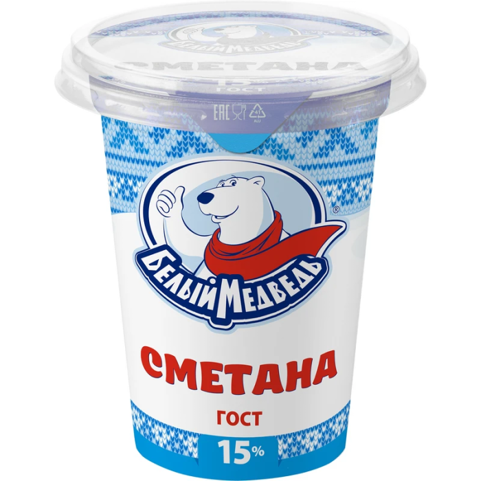 Сметану "Белый Медведь" производят традиционным способом из сливок путем сквашивания их закваской, приготовленной на чистых культурах молочнокислых бактерий. Сметана не содержит никаких посторонних добавок, благодаря чему имеет приятный кисломолочный вкус и нежную консистенцию